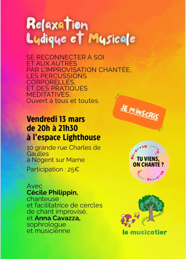 Dans le cadre de l’association « Le Musicotier », en ma veste de sophrologue, j’organise un atelier de Relaxation Ludique et Musicale destiné aux adultes, avec Cécile Philippin, chanteuse, pianiste et compositrice, et facilitatrice de cercles de chant improvisé (association « Tu viens on chante » à Montreuil).